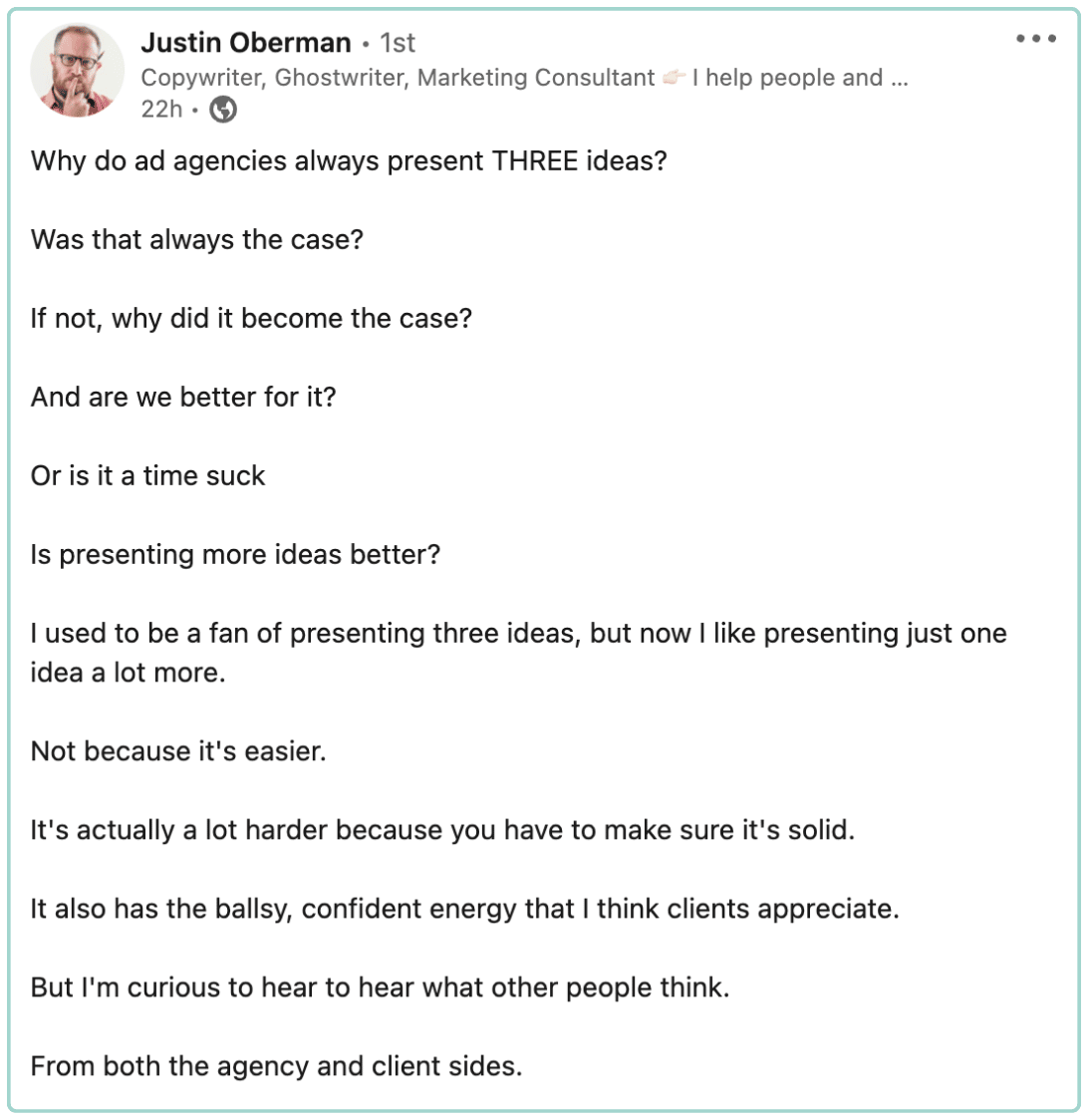 Welcome to Thought Reader A collection of POVs on creativity, leadership, and all things marketing Thanks so much for being here for the first edition of the Thought Reader newsletter! I created this as an outlet to share some of the thought-provoking pieces I find on LinkedIn (the headquarters of thought leadership), TikTok, YouTube, Reddit, Fishbowl, podcasts, and more. Because, beyond the cringey posts about 2-year-olds saying profound things and the unhelpful, sometimes toxic, posts you...